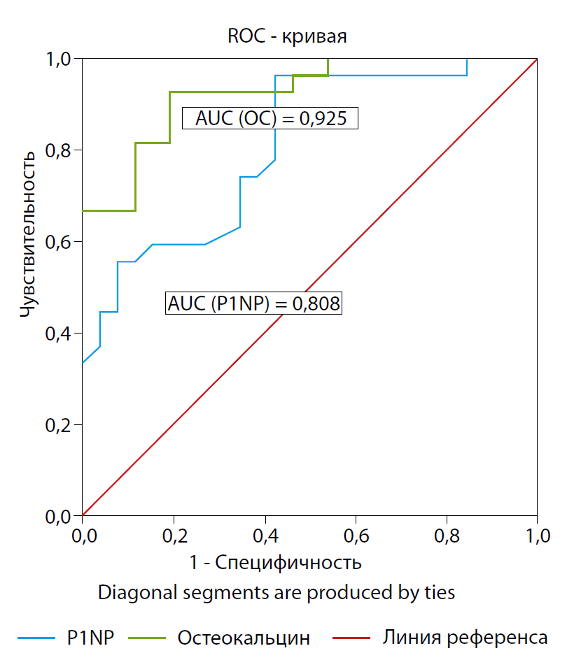 Results: 29 patients with Cushing’s disease and 27 healthy individuals from the control group were included in the study. There were no differences in age, sex and body mass index (p = 0.488, 0.426 and 0.531, respectively). Both studied bone formation markers (osteocalcin and P1NP) were reduced in patients with CD: 8.53 ng/ml (Q25%;Q75% 5.40; 12.41) versus 22.45 ng/ml (Q25%;Q75% 17.36; 26.31) (p <0.001) and 28.50 ng/ml (Q25%;Q75% 18.00; 44.00) versus 56.50 ng/ml (Q25%;Q75% 39.50; 65.50) (p <0.001), respectively. The area under the receiver operating characteristic curve (AUC) was 0.808 (95% CI 0.693–0.924) for P1NP and 0.925 (95% CI 0.857–0.992) for osteocalcin, that indicates the greater diagnostic value of osteocalcin for CD verification in healthy controls. Optimal cut-off points were obtained: 53.4 ng/ml (values below are more typical for patients with CD; sensitivity of the method is 96.55%, specificity 57.69%) for P1NP and 15.285 ng/ml (below for patients with CD; sensitivity was 92.59%, specificity 77.78 %) for osteocalcin.