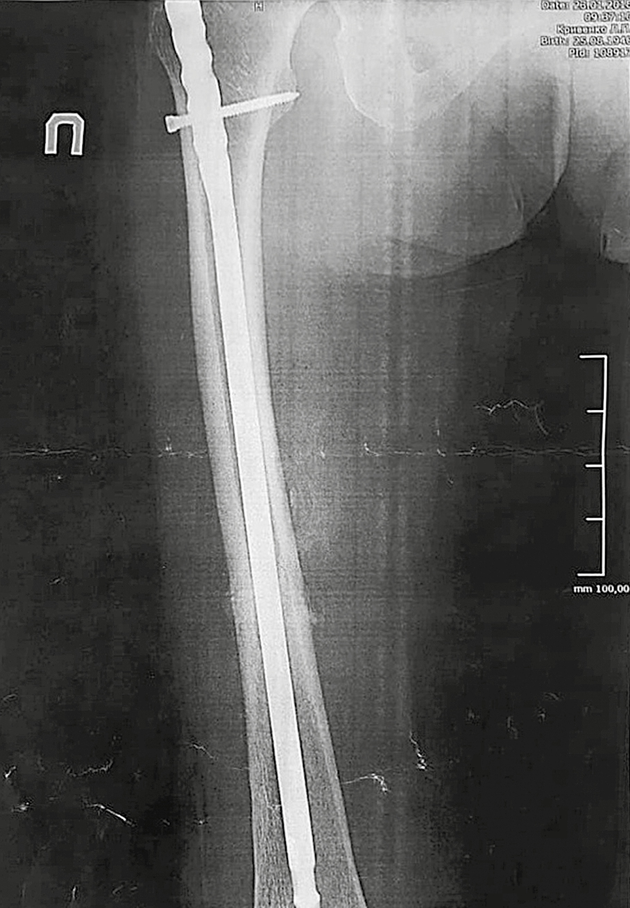 3. Fig. 3. Radiograph of the right thigh of patient K. 8 weeks after the intramedullary osteosynthesis of the femur with a pin with a blocker, dated January 26, 2018.