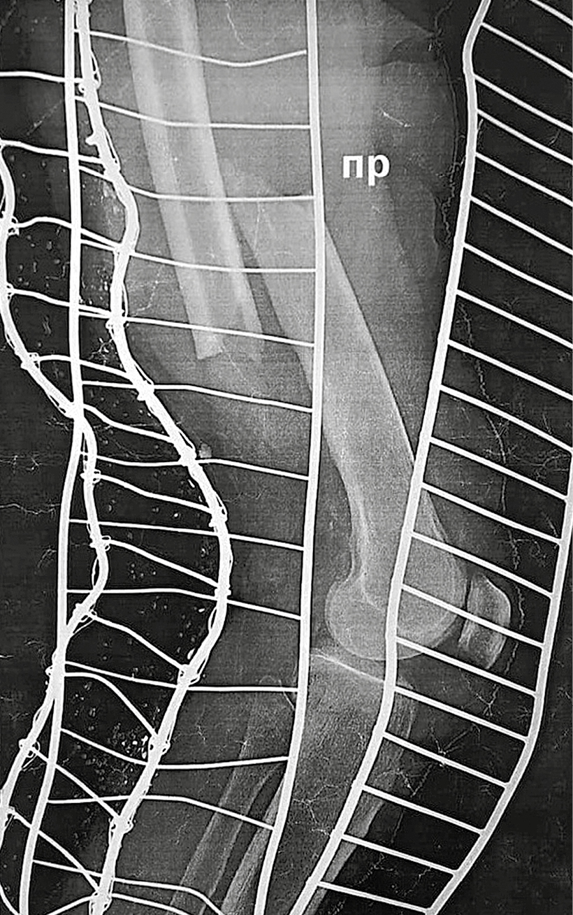 2. Fig. 2. Radiograph of the right lower limb of patient K. on the day of transverse diaphyseal atypical fracture of the right femur, type 42A1 according to the classification of the Osteosynthesis Association, dated 04.12.2017. | |