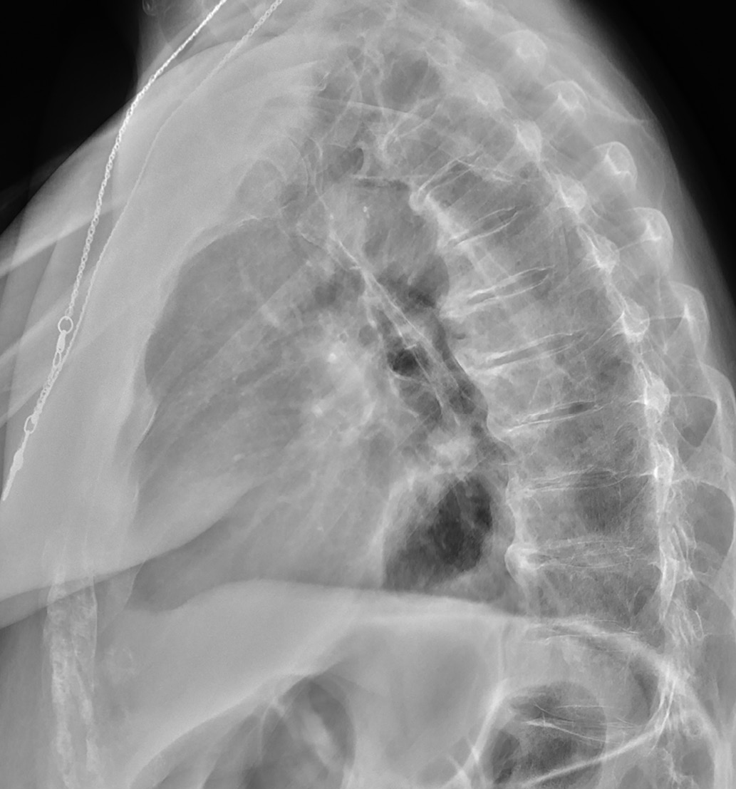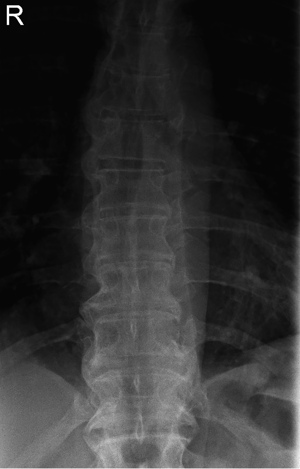 3. Fig. 3. Pronounced calcification of the anterior longitudinal ligament of the thoracic and lumbar spine, mainly on the right in a patient born in 1960 with acromegaly.