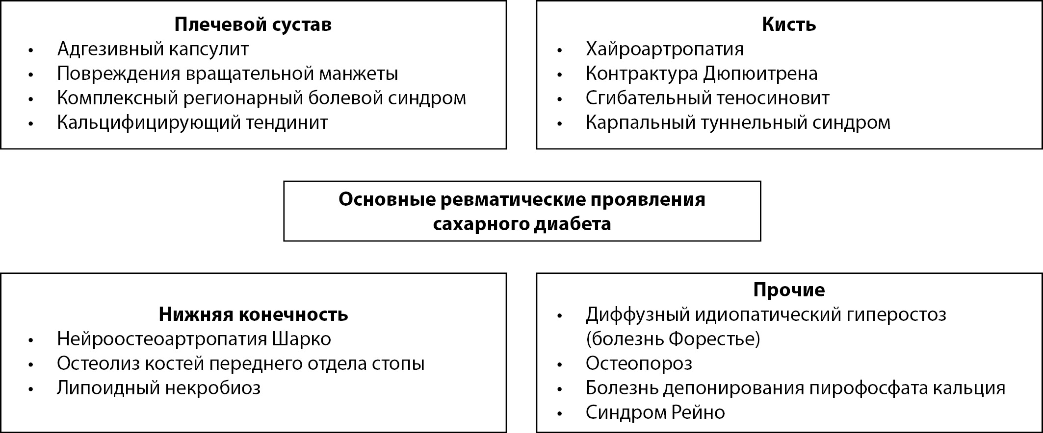 Diabetes mellitus (DM) can lead to the development of late complications. In addition to the traditional late complications, a high prevalence of damage to the musculoskeletal system in diabetes was noted. The most appropriate term that reflects the defeat of the musculoskeletal system in diabetes is «limited joints mobility syndrome» (LJM). Damage to the hands in the presence of open painless stiffness of the joints, fixed flexion contractures, impaired fine motor skills of the hands and grip forces. Subsequently, it became clear that, over time, the restriction of joint mobility develops not only in the small joints of the hands, but also in other large and small joints of the limbs. Traditionally, LJM syndrome pays low attention on the part of practitioners in comparison with other micro- and macrovascular complications of diabetes, even though LJM can significantly impair functional activity, self-care, and impair the quality of life. It is assumed that damage to the periarticular tissues and joints in DM is caused by the accumulation of end glycation products. A decisive place in the diagnosis of LJM is the clinical examination. In the presence of LJM syndrome, the osteoarticular structures of the feet can be affected, timely diagnosis can lead to the development of diabetic foot syndrome.