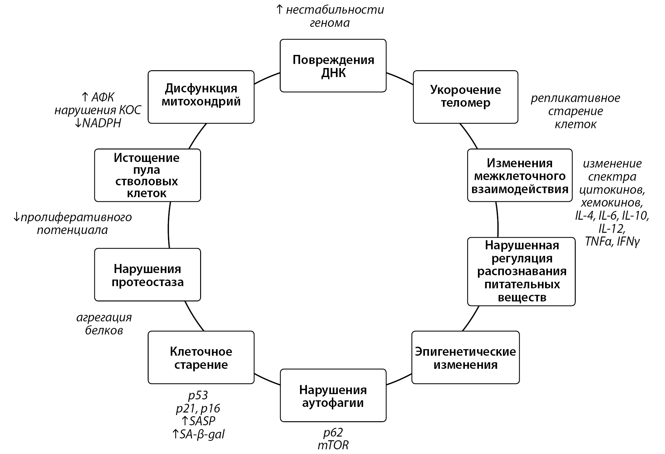 Старение – универсальный и закономерный биологический процесс, характеризующийся снижением компенсаторных возможностей организма. Определенную роль в биологическом старении клеток играют генетические и эпигенетические механизмы, такие как метилирование ДНК, посттрансляционные модификации гистонов Н2А, Н2В, Н3 и Н4, обеспечивающие укладку ДНК в ядре и являющиеся важным механизмом эпигенетической регуляции структуры и функций хроматина. Кроме того, одним из факторов, влияющим на продолжительность жизни клетки, является скорость укорочения теломер – концевых участков хромосом [1].
