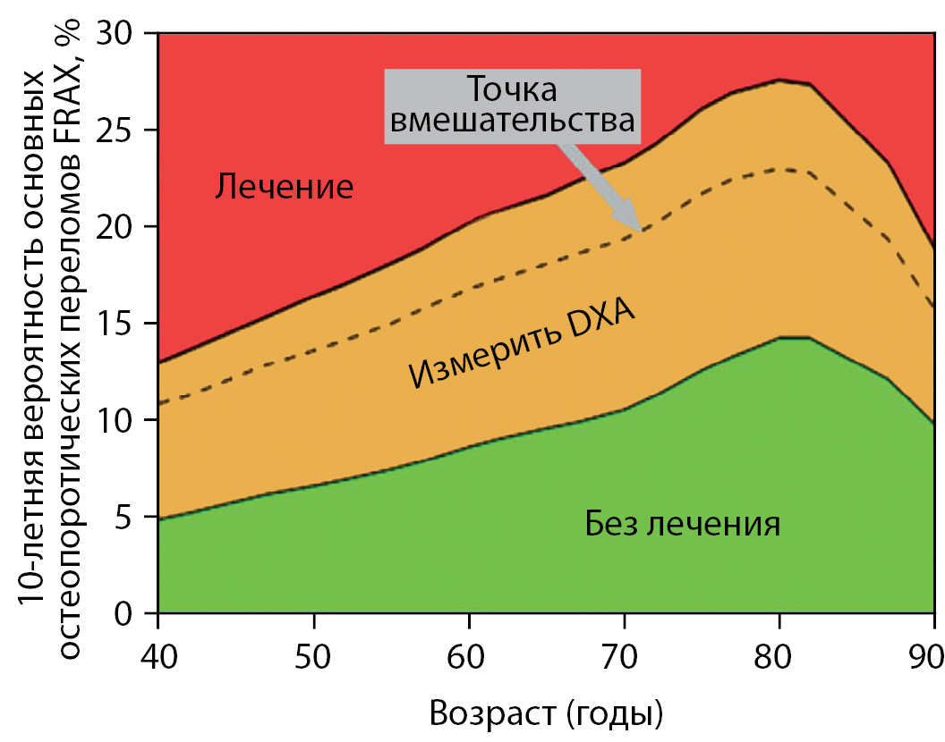 В клинической практике основной задачей врача служит определение необходимости начала терапии остеопороза у пациента. В настоящее время для решения этого вопроса используют калькулятор FRAX, который позволяет определить 10-летнюю вероятность всех переломов и отдельно переломов бедренной кости [8]. На основании полученных результатов с помощью специальных таблиц и графиков (рис. 2) принимается решение о начале медикаментозной терапии или продолжении динамического наблюдения за пациентом. В последнее время в калькулятор FRAX добавлена возможность оценить вероятность переломов с учетом показателя ТКИ, что может повлиять на принятие решения о начале терапии, в частности, у пациентов с СД2. Однако использование FRAX с учетом ТКИ у больных с СД2 типа изучено недостаточно и требует проведения дальнейших исследований.