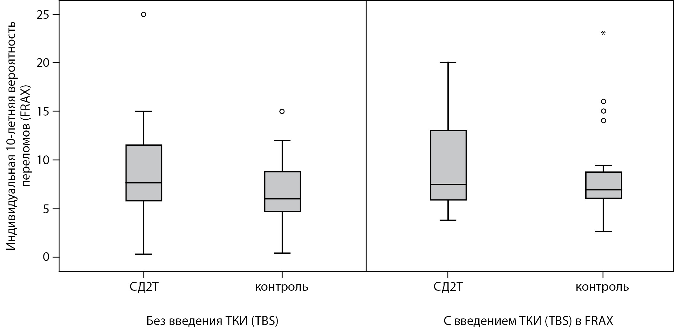 Выводы. ТКИ повышает результаты оценки индивидуальной 10-летней вероятности переломов (FRAX) и может быть одним из диагностических критериев определения вероятности переломов у пациентов с СД2. Вместе с тем необходимо дальнейшее изучение новых диагностических инструментов и их применения при СД2.