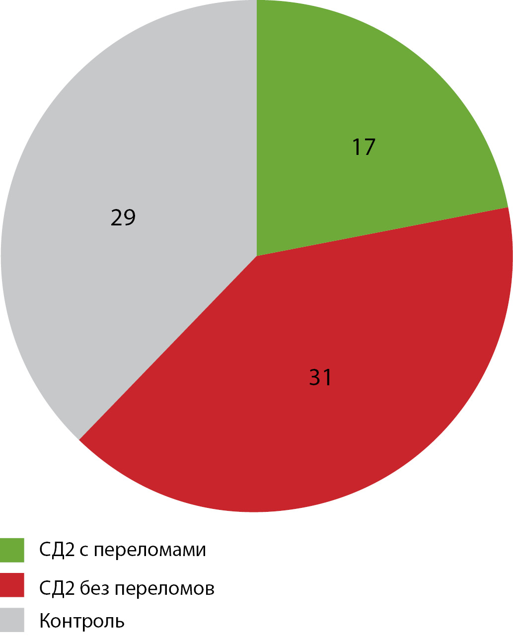 Results. We enrolled 48 patients with T2DM, including 17 with a history of low-traumatic fracture, 31 patients without fractures and 29 subjects of a control group. BMD was higher in patients with T2DM compared to the control group at L1–L4 (mean T-score 0.44, 95% CI -3.2 – 4.9 vs mean T-score 0.33, 95% CI -2.9 – 3.0 in a control group p=0.052) and Total Hip (mean T-score 0.51, 95% CI -2.1 – 3.0 vs mean T-score -0.03, 95% CI -1.4 – 1.2 in a control group p=0,025). The TBS and 10-year probability of fracture (FRAX) was not different in patients with T2DM versus the control group. However, when the TBS was entered as an additional risk factor, the 10-year probability of fracture became higher in patients with T2DM (10-year probability of fracture in T2DM- 8.68, 95% CI 0.3-25.0 versus 6.68, 95% CI 0.4–15.0 in control group, p=0.04). Among patients with diabetes with and without fractures the FRAX score was higher in subjects with fractures, but no difference was found in regards to BMD or TBS. Entering BMD and TBS values into the FRAX tool in subjects with diabetes and fractures decreased the FRAX score. However, patients with low-traumatic fractures should be treated for osteoporosis without a BMD, TBS or FRAX assessment.