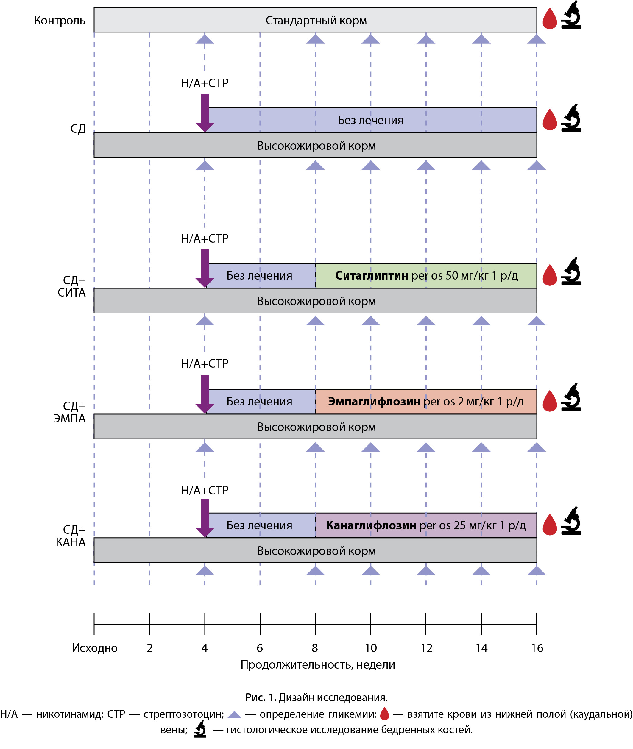 Через 4 нед от начала опыта осуществлялось введение раствора никотинамида (Nicotimamide, Sigma-Aldrich, St. Louis, MO, США) 230 мг/кг внутрибрюшинно, через 15 мин — раствора стрептозотоцина (Streptozocin, Sigma-Aldrich, St. Louis, MO, США) 60 мг/кг внутрибрюшинно для индукции СД 2 типа. Данная методика моделирования СД 2 типа при помощи содержания животных на диете, богатой насыщенными жирами, с последующим применением никотинамида и стрептозотоцина применяется в экспериментальных исследованиях и была апробирована нами ранее [9].