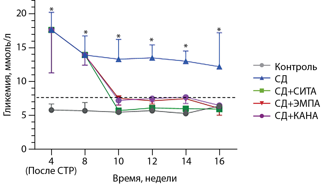 В контрольной группе измерение гликемии осуществлялось в конце 4, 8, 10, 12, 14 и 16-й недели эксперимента (постпрандиальные измерения). В группе «СД» определение гликемии производилось через 4 нед эксперимента (на 2 и 3-й день после введения стрептозотоцина), в конце 8, 10, 12, 14 и 16-й недели эксперимента (постпрандиальные измерения). В группах «СД+СИТА», «СД+ЭМПА», «СД+КАНА» оценку гликемии проводили через 4 нед эксперимента (на 2-й и 3-й день после введения стрептозотоцина), в конце 8-й недели, затем каждый 3-й день в течение 8 нед лечения в одно и то же время дня (постпрандиальная гликемия), через 5 ч после лечения.