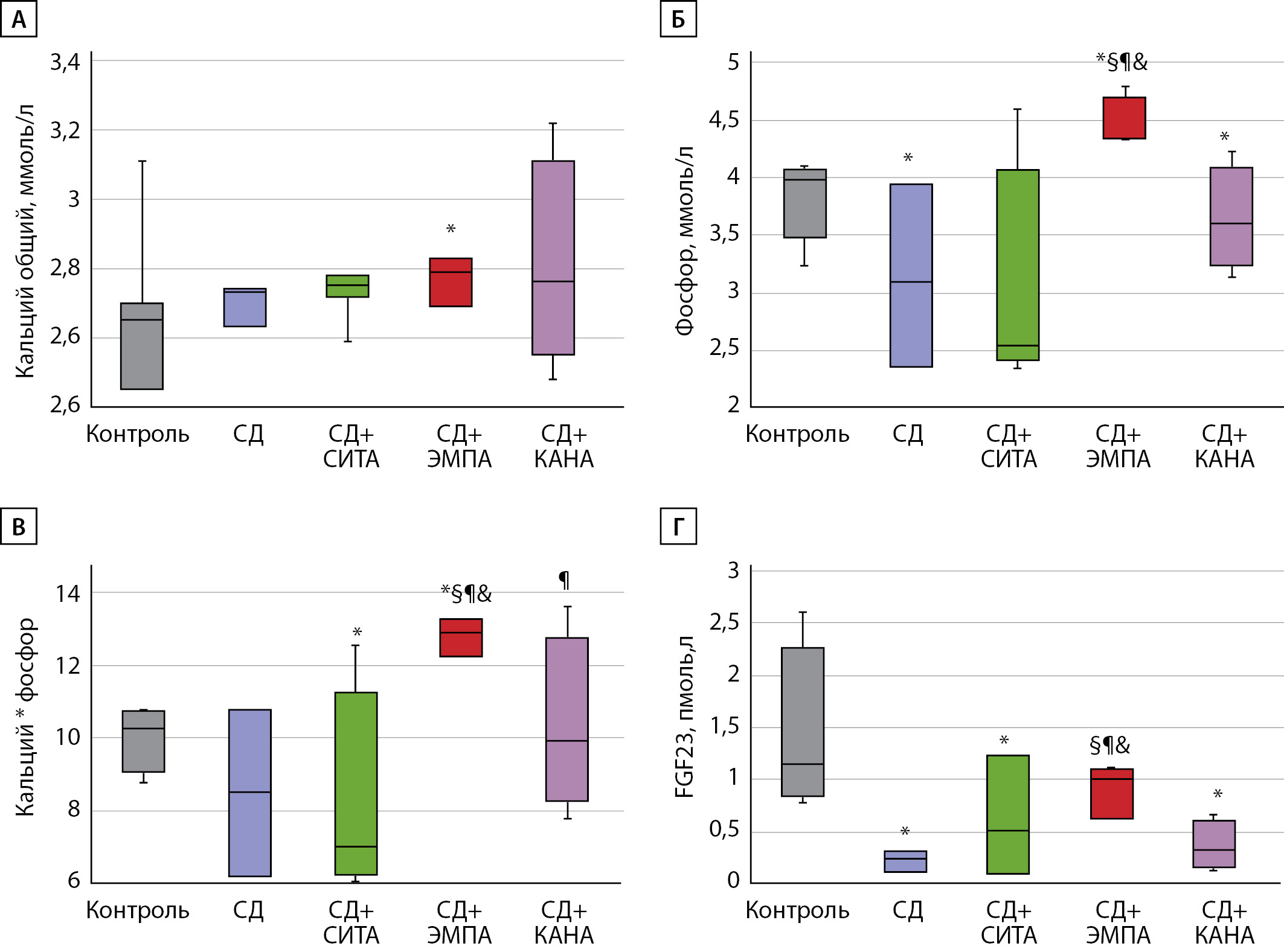 Рис. 3. Показатели фосфорно-кальциевого обмена на фоне различных вариантов сахароснижающей терапии. А — концентрация общего кальция; Б — концентрация фосфора; В — кальций-фосфорное произведение; Г — концентрация фактора роста фибробластов-23. Результаты представлены в виде коробчатых графиков (box-plot), средняя линия соответствует медиане, центральная часть графика — нижнему (25%) и верхнему (75%) квартилям распределения, линии погрешностей — минимальному и максимальному значению в группе. FGF23 — фактор роста фибробластов-23. * — р<0,05 по сравнению с группой «Контроль»; § — р<0,05 по сравнению с группой «СД»; ¶ — р<0,05 по сравнению с группой «СД+СИТА», & — р<0,05 между группами «СД+ЭМПА» и «СД+КАНА».