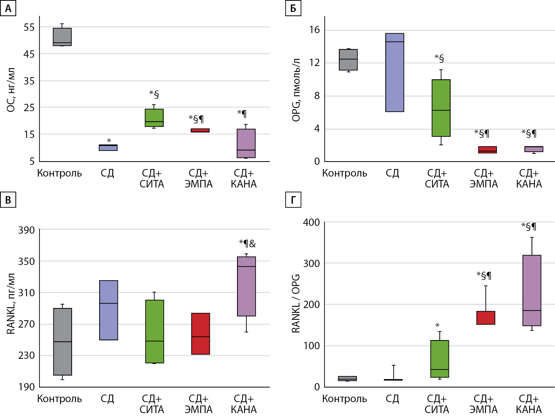 4. Рис. 4. Параметры костного обмена на фоне различных вариантов сахароснижающей терапии. А — концентрация остеокальцина; Б — концентрация остеопротегерина; В — концентрация лиганда активатора рецептора ядерного фактора каппа-бета (RANKL); Г — соотношение RANKL/остеопротегерин. Результаты представлены в виде коробчатых графиков (box-plot), средняя линия соответствует медиане, центральная часть графика — нижнему (25%) и верхнему (75%) квартилям распределения, линии погрешностей — минимальному и максимальному значению в группе. ОС — остеокальцин; OPG — остеопротегерин; RANKL — лиганд активатора рецептора ядерного фактора каппа-бета. * — р<0,05 по сравнению с группой «Контроль»; § — р<0,05 по сравнению с группой «СД»; ¶ — р<0,05 по сравнению с группой «СД+СИТА»; & — р<0,05 между группами «СД+ЭМПА» и «СД+КАНА».