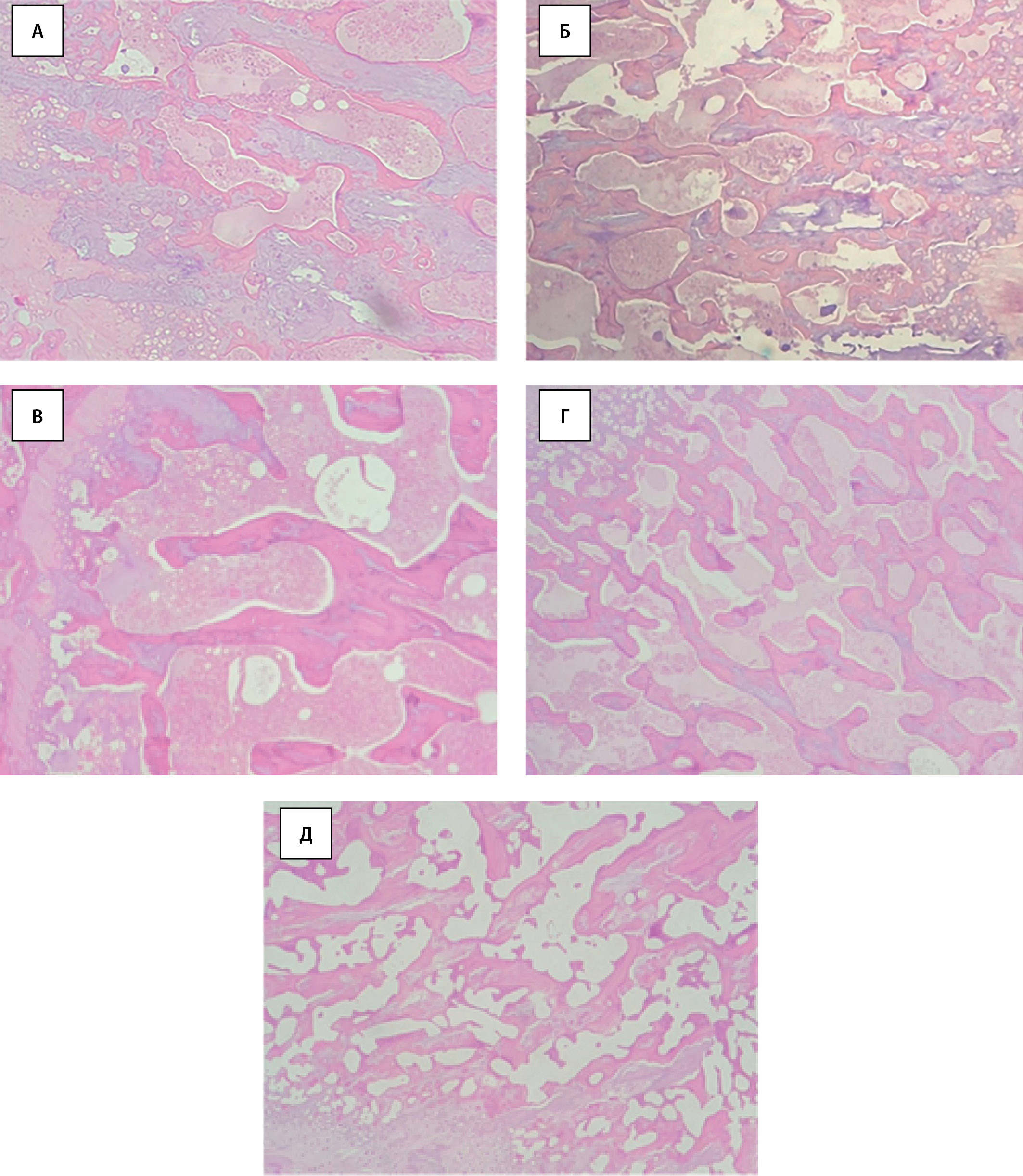 Рис. 5. Эпифизарная область кости с костными балками. А — «Контроль»; Б — «СД»; В — «СД+СИТА»; Г — «СД+ЭМПА»; Д — «СД+КАНА». Окраска гематоксилином-эозином, х100.