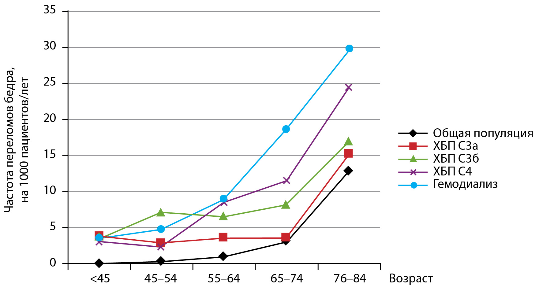 2. Рис. 2. Частота переломов бедра в зависимости от возраста в общей популяции и у пациентов с различными стадиями ХБП [26]. | |
