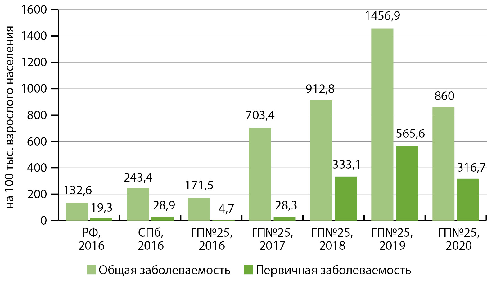 На рис. 1 приведены общая и первичная заболеваемость остеопорозом, полученные на основании регистрации случаев в медицинской статистике в городской поликлинике № 25 Невского района, в сравнении с данными по Российской Федерации и городу Санкт-Петербургу. В течение всего времени проведения скрининга отмечался рост первичной и общей заболеваемости остеопорозом до 2019 г., после чего выявляемость снизилась, что мы объясняем, с одной стороны, достижением определенного охвата скринингом населения, посещающего поликлинику, с другой — возникшей пандемией новой коронавирусной инфекции, когда врачи были загружены ведением пациентов с этой инфекцией, а пациенты по возможности старались не посещать поликлинику во избежание инфицирования.