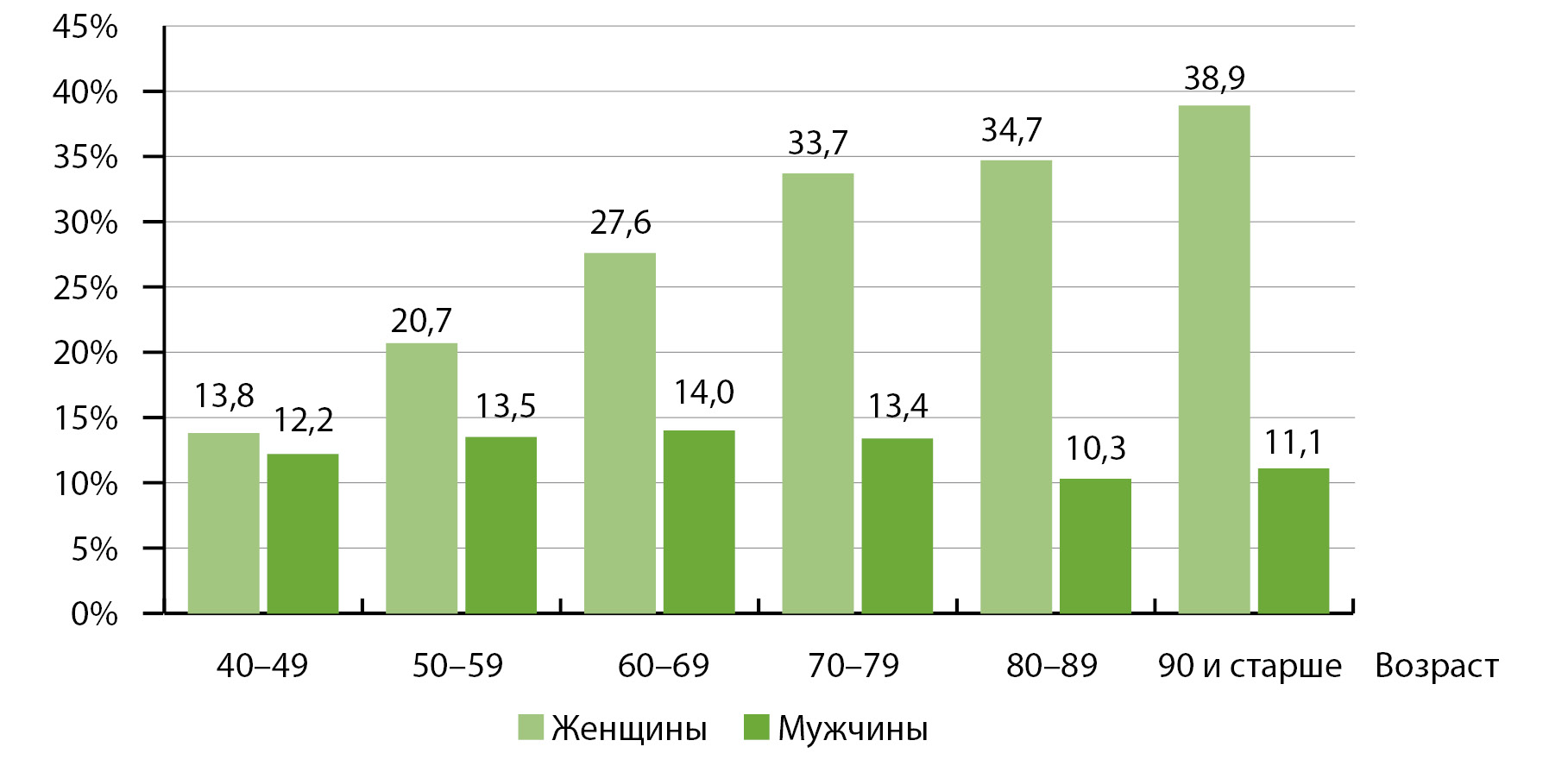 Рис. 3. Доля лиц с высоким риском переломов в разных возрастных группах скринированных мужчин и женщин