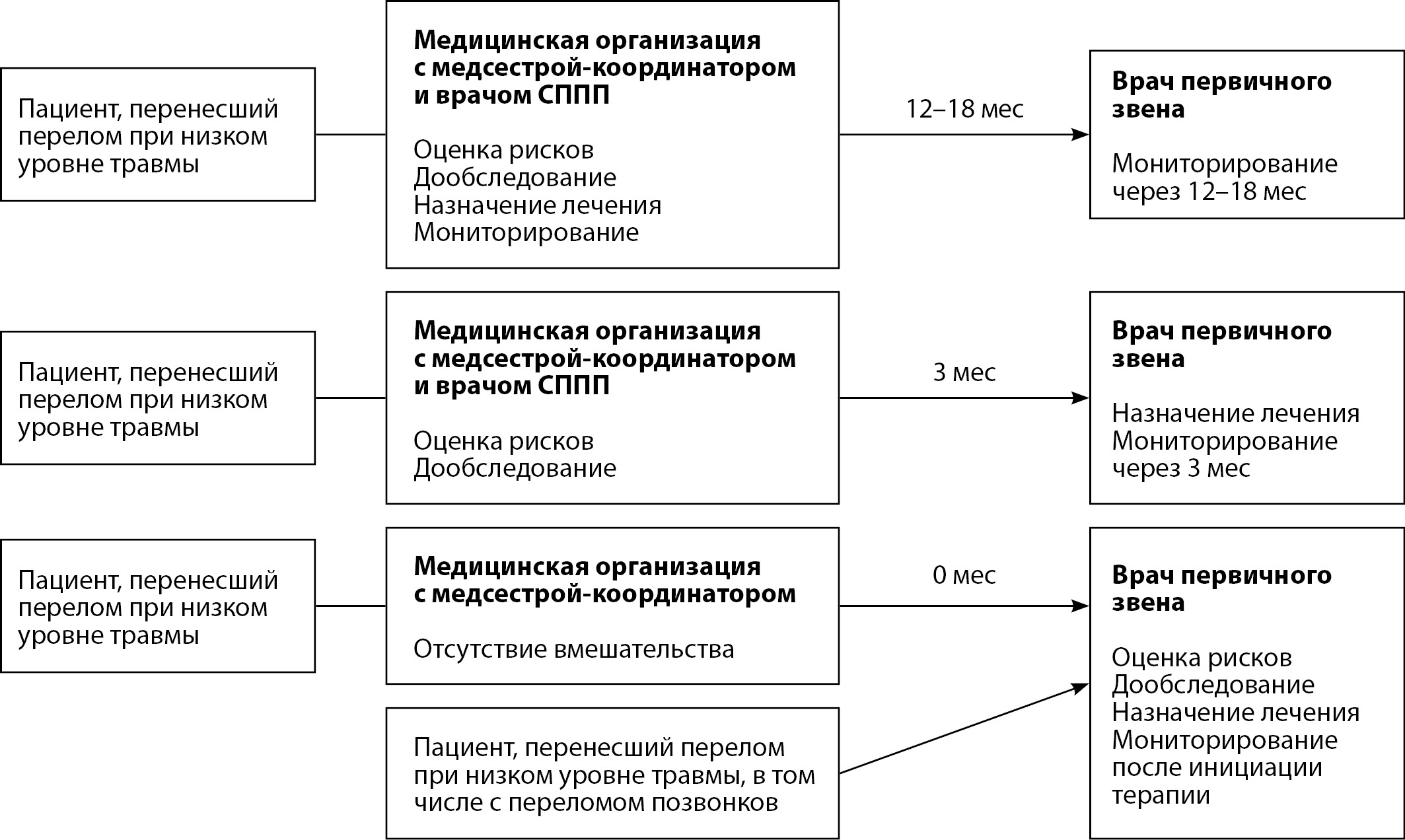 Передача пациента из СППП врачу первичного звена может происходить после проведения обследования, уточнения диагноза и лечения пациента в службе через 12–18 мес после перелома (модель А) или после обследования, уточнения диагноза и получения рекомендаций по лечению, но без инициации терапии через 12 нед после перелома (модель B). Согласно модели С, пациент передается врачу первичного звена сразу после получения травматологической помощи, а дальнейшее обследование, оценка рисков и лечение осуществляются врачом первичного звена [5]. Медицинская сестра-координатор играет важную роль в мультидисциплинарном подходе при ведении пациентов с низкоэнергетическими переломами во всех трех моделях, в том числе обеспечивая маршрутизацию пациента от травматолога к врачу первичного звена [6].