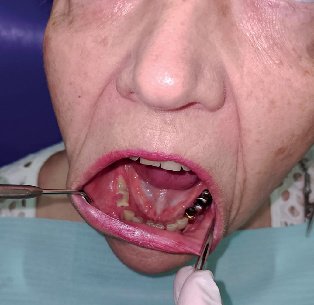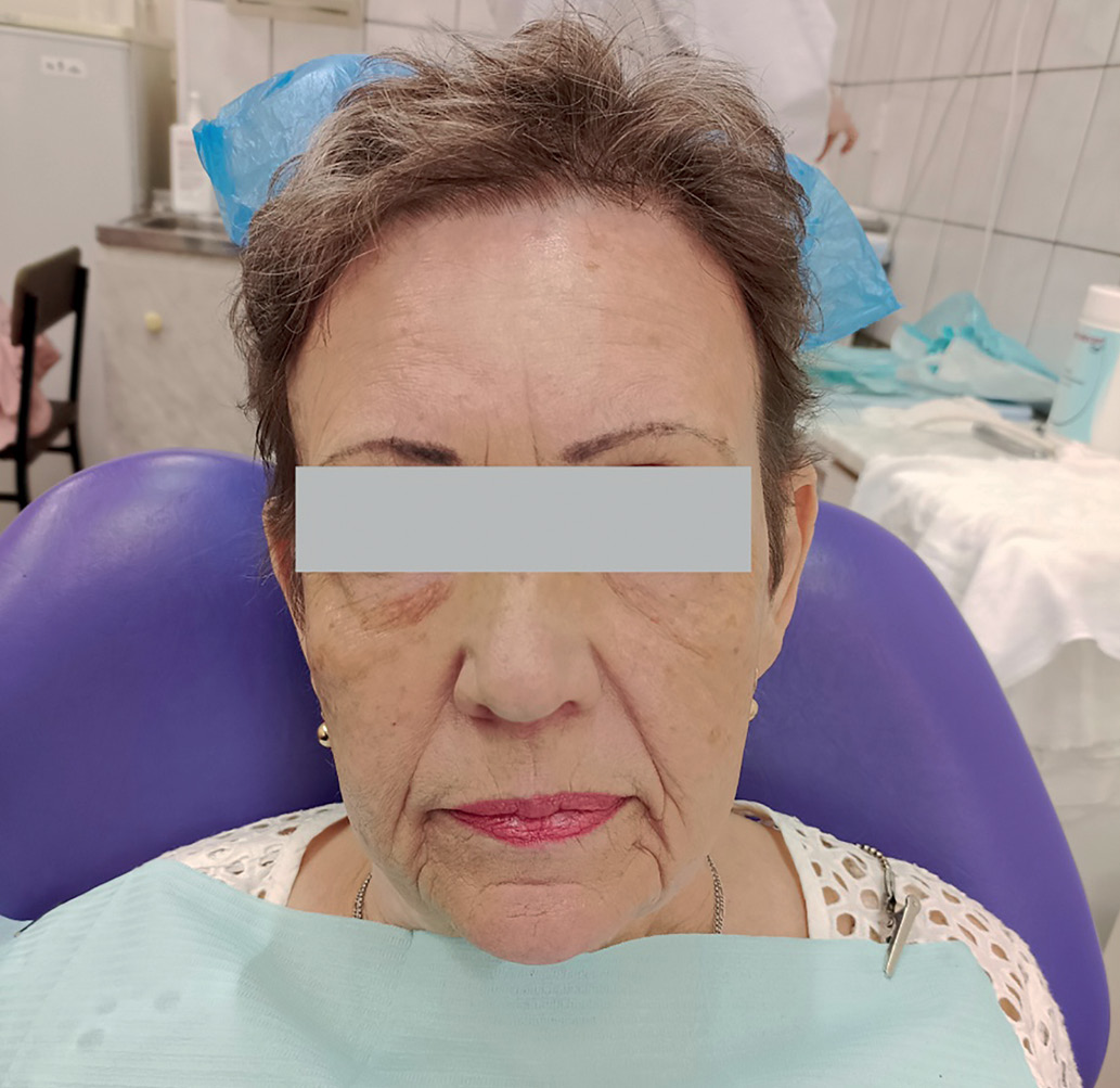 По прошествии 6 мес. после оперативного вмешательства больная С. предъявляла жалобы на наличие оголенного участка костной ткани нижней челюсти справа, гноетечение и боли в области удаленных зубов 4.4, 4.5. Состояние больной можно было оценить как удовлетворительное, конфигурация лица была не изменена, кожные покровы лица розового цвета, без патологических элементов, открывание рта свободное на 4 см, подбородочные, подчелюстные и шейные (поверхностные, глубокие) лимфатические узлы не пальпировались, тактильная и болевая чувствительность тканей челюстно-лицевой области была не нарушена (рис. 1). В позиции зубов 4.4, 4.5 определялись гиперемия, отечность, болезненность при пальпации слизистой оболочки полости рта. В области удаленных зубов 4.4, 4.5 визуализировался участок оголенной костной ткани размером 7 мм по ширине и 15 мм по длине, неподвижный, с неровной поверхностью, грязно-серого цвета, по периферии определялось нарушение прикрепления десны к кости с образованием участка неприкрепленной десны глубиной от 10 мм с вестибулярной стороны до 6 мм с язычной стороны оголенного участка, из-под десны выделялся гнойный экссудат. Отмечался ихорозный запах (рис. 2).