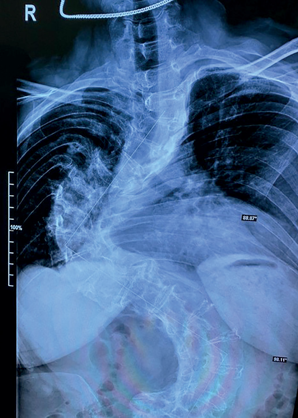 На представленной рентгенограмме грудного и поясничного отделов позвоночника, проведенной в этом году, отмечается значительное искривление грудного отдела позвоночника вправо с углом сколиоза 91° и столь же выраженное искривление поясничного отдела позвоночника влево с углом сколиоза 82° (рис. 1). Помимо этого, имеется ротация грудных и поясничных позвонков влево 1–2 степени, о чем свидетельствует визуализация правых реберно-позвоночных сочленений на уровне III–IV ребер, обычно незаметных в прямой проекции, и теней остистых отростков поясничных позвонков, смещенных резко вправо от срединной линии. Таким образом, рентгенологически определяется искривление позвоночника не менее чем в двух плоскостях.