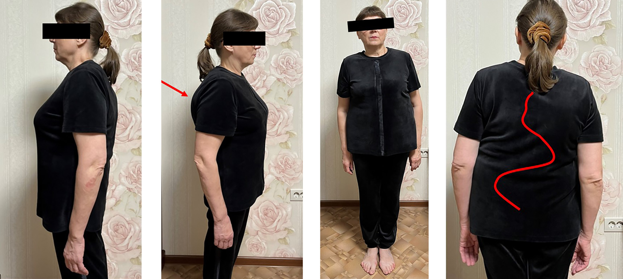 При осмотре отмечались изменение осанки, деформация и укорочение грудной клетки с формированием заднего правостороннего реберно-позвоночного горба (рис. 2).