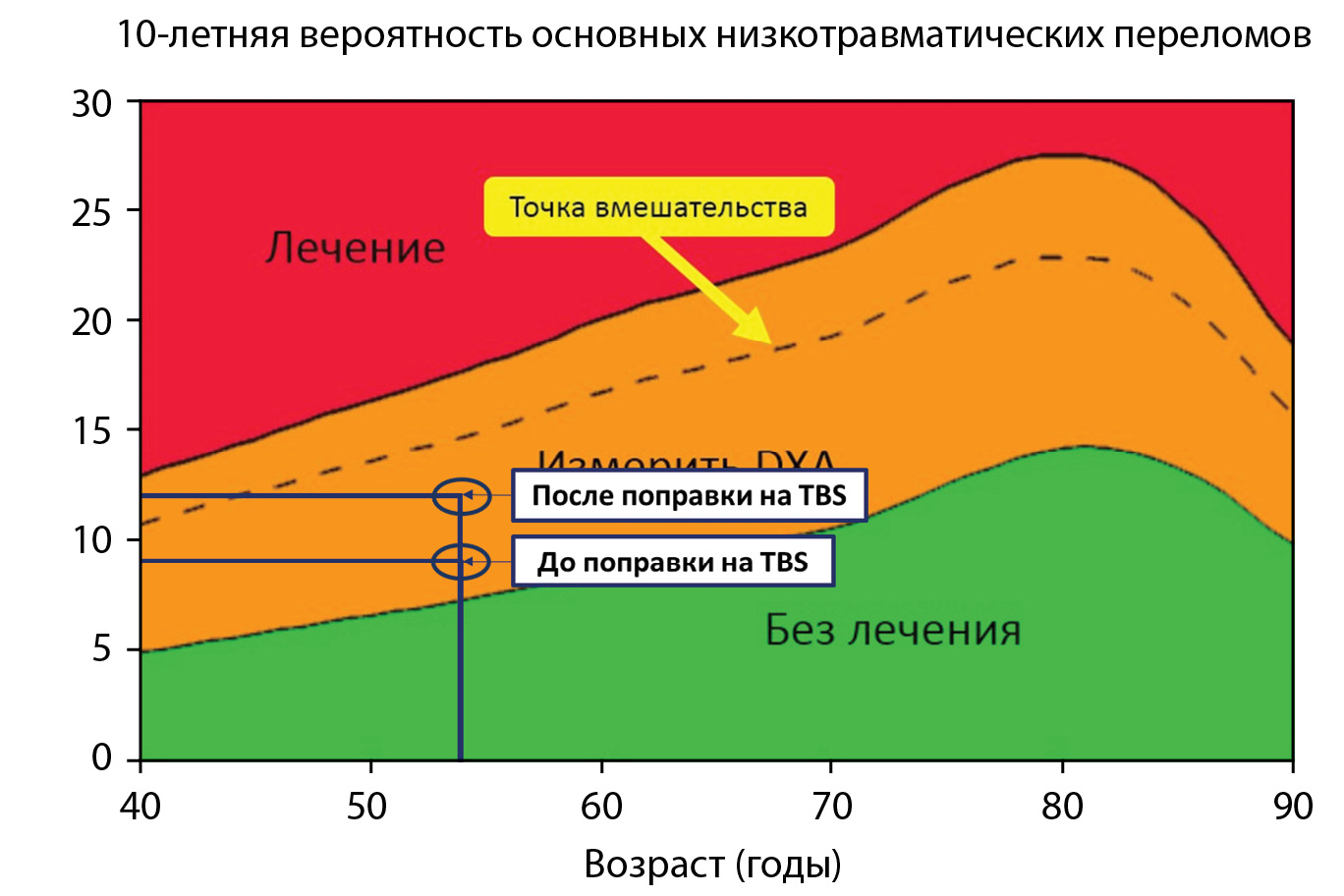 5. Рисунок 5. 10-летний риск основных низкотравматических переломов по Калькулятору FRAX® до и после гипотетической поправки на трабекулярный костный индекс. | |