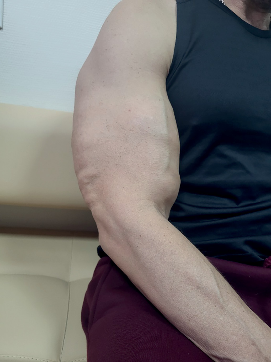 В феврале 2023 г. при осмотре в эндокринологическом терапевтическом отделении №1 УКБ №2 Сеченовского Университета: масса тела — 89 кг, рост — 186 см, ИМТ — 25,2 кг/м². Мягкие ткани плеч выраженно увеличены, отмечается неровность контура, при пальпации бицепса и трицепса — каменистая плотность. Обращают внимание множественные узелковые подкожные образования по всему телу (на правом бедре, груди, ногах). Подкожно-жировой слой развит недостаточно, распределение равномерное.