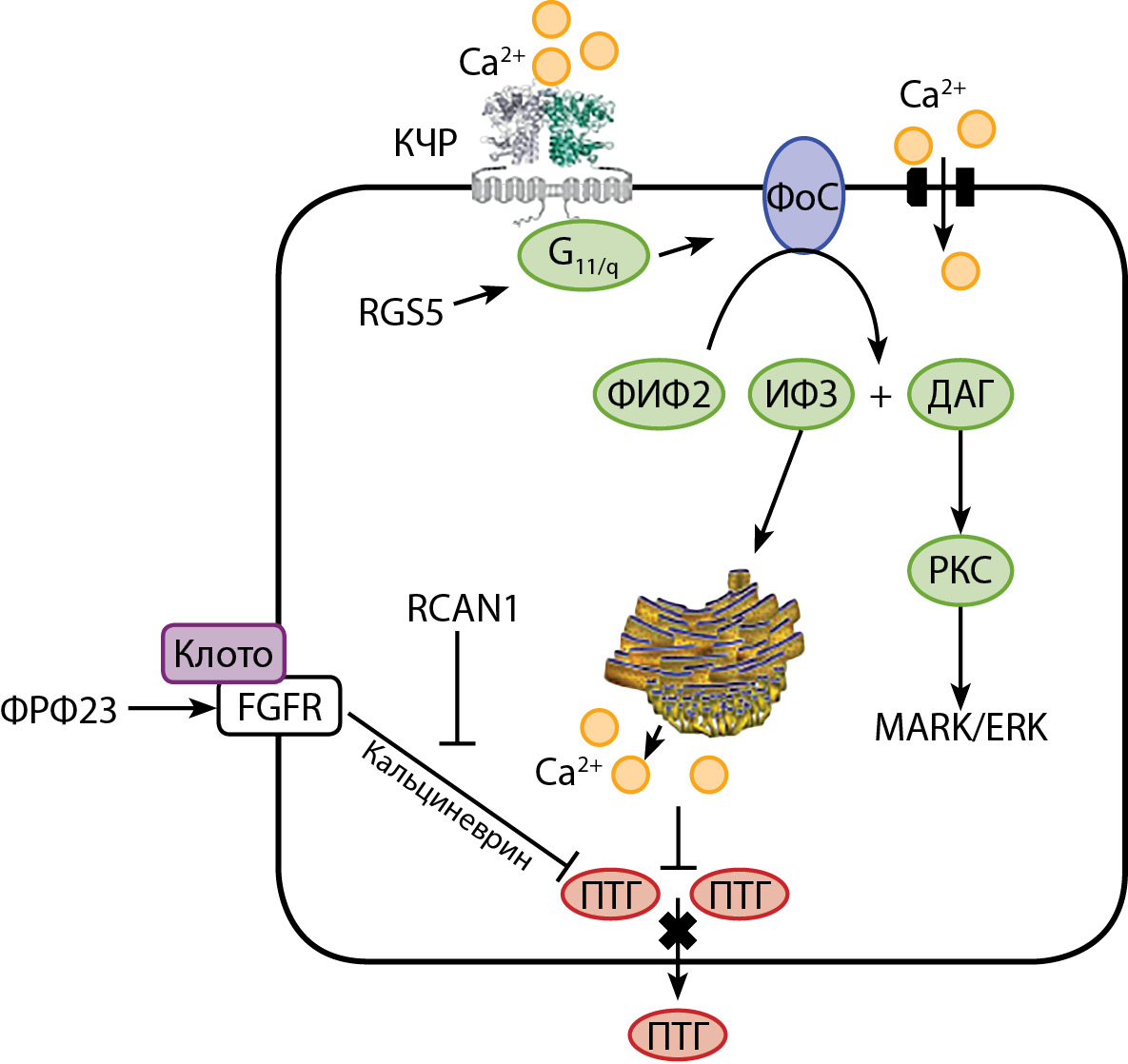 Функционирование КЧР, расположенного в клетках околощитовидных желез, представлено на рисунке 2. Активация КЧР происходит, когда ионы кальция связываются с надмембранным доменом рецептора, что приводит к увеличению активности G-белков, расположенных на внутренней мембране клетки. Передача сигнала, опосредованная G-белками, контролируется при помощи белка RGS5 (регулятор передачи сигналов G-белка 5). Критически важным белком в правильном функционировании КЧР является семейство белков G11/q. Активация данных белков приводит к действию фосфолипазу С, которая катализирует расщепление фосфатидилинозитоладифосфата в диацилглицерол (ДАГ) и инозитолтрифосфат (ИФ3). Главная функция ИФ3 заключается в увеличении концентрации кальция в цитозоле клетки, что реализуется двумя механизмами. Первый механизм реализуется при помощи ИФ3, который связывается со своими рецепторами на поверхности эндоплазматического ритикулома, что способствует выбросу кальция из внутриклеточных депо. Другим механизмом является открытие кальциевых каналов на мембране клетки, что приводит к притоку кальция извне. Все указанные механизмы, опосредованные активацией КЧР, увеличивают внутриклеточную концентрацию кальция. Такое повышение препятствует слиянию секреторных гранул, содержащих ПТГ, с мембраной клетки ОЩЖ. Это приводит к снижению секреции ПТГ, а также к ингибированию реабсорбции кальция почками [7][8][9]. В свою очередь ДАГ совместно с растущей внутриклеточной концентрацией кальция активирует протеинкиназу С, регулятора внутриклеточного сигнального пути МАРК/ERK, который контролирует избыточную пролиферацию клеток ОЩЖ. Другие молекулы — например, фактор роста фибробластов 23 (ФРФ 23) — вместе со своим ко-рецептором Клото также участвуют в работе КЧР, подавляя избыточный синтез ПТГ. Регуляторный путь, опосредованный действием ФРФ 23, в свою очередь, регулируется кальциневрином и его ингибитором RCAN1.