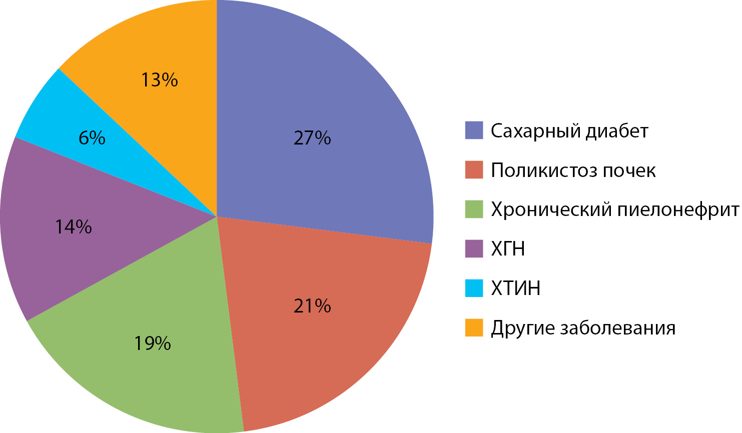 В Тюменской области маршрутизация пациентов с ХБП осуществляется в единый областной нефрологический центр, основанный на базе ГБУЗ ТО «Областная клиническая больница №1» г. Тюмени (приказ Департамента здравоохранения Тюменской области №20/15 от 16 августа 2018 г.). Для определения наиболее частой этиологической причины ХБП были отобраны истории болезни пациентов (n=416) с установленным диагнозом ХБП С3–С5 и ВГПТ. По результатам I этапа исследования установлено, что СД занимает первое место среди всех причин ХБП в сочетании с ВГПТ (27%), опережая нозологические причины поражения почек и другие патологические состояния (рис. 1).