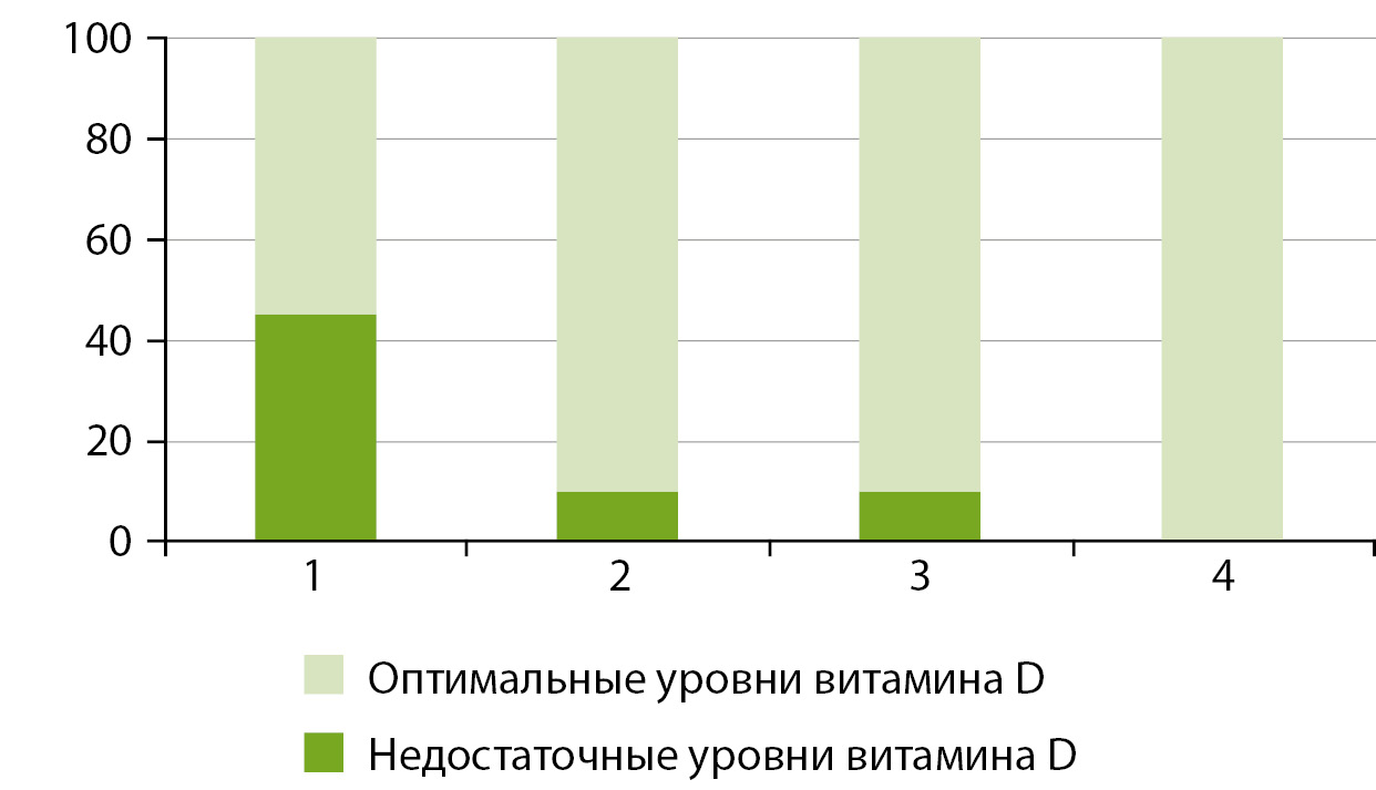 1. Рисунок 1. Распределение долей среди мужчин (%) с оптимальными и недостаточными уровнями витамина D по сезонам, где: 1 — период увеличения продолжительности светового дня (март), 2 — период максимальной продолжительности светового дня (июнь), 3 — период снижения продолжительности светового дня (сентябрь), 4 — период минимальной продолжительности светового дня (декабрь).