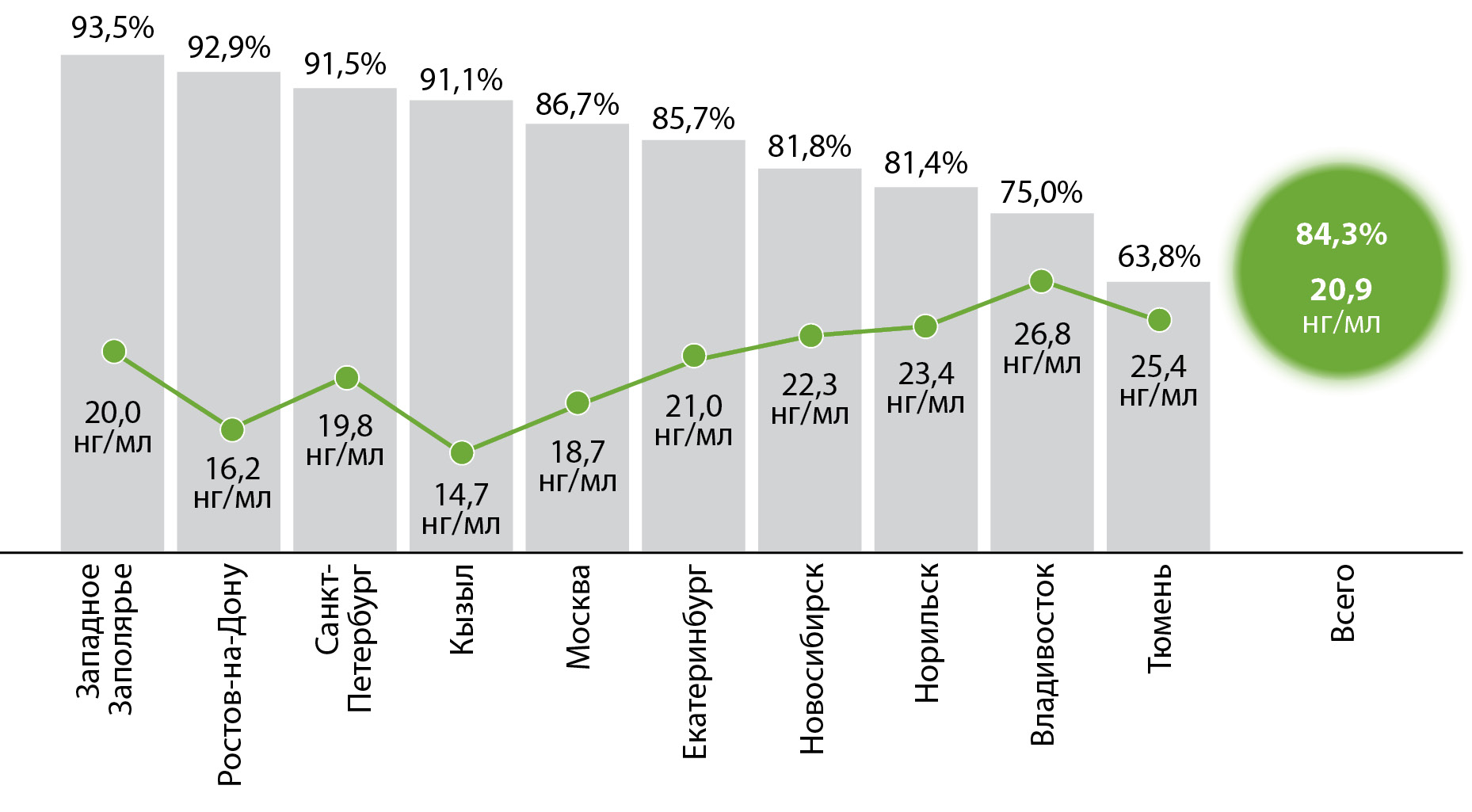 Рисунок 1. Распространенность недостаточности и дефицита витамина D в России.