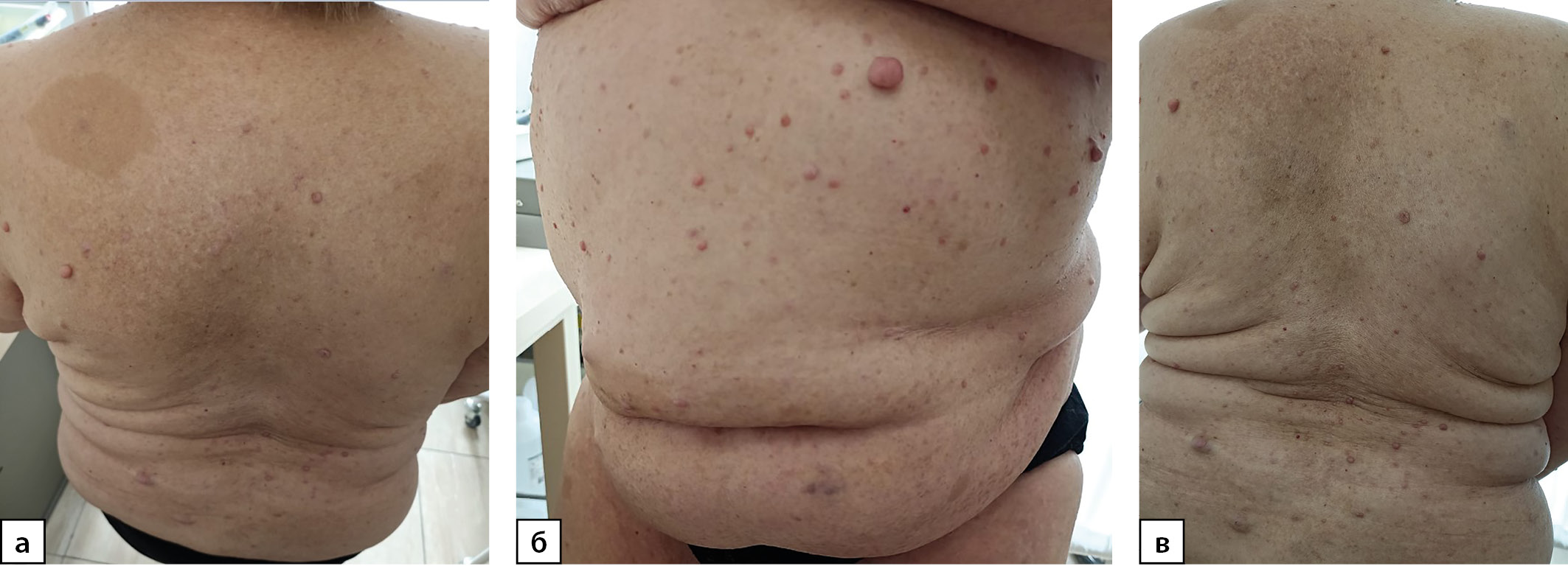 1. Рисунок 1. Кожные проявления у пациентки П. а) пятна по типу «кофе с молоком», б) множественные нейрофибромы на коже живота, в) множественные нейрофибромы на коже спины. | |