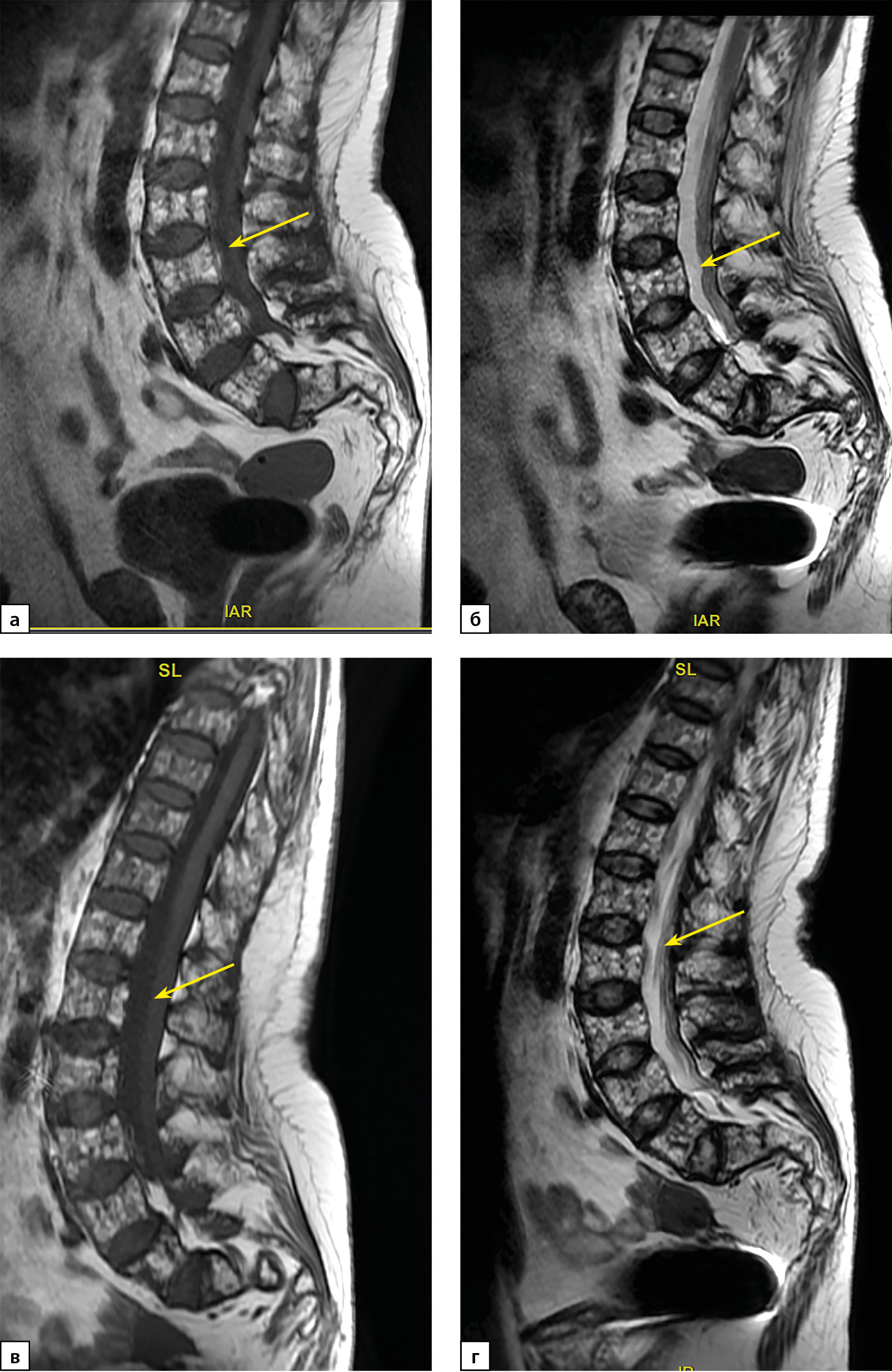 2. Рисунок 2. Пациентка П. МРТ-исследование поясничного отдела позвоночника в сагиттальной проекции: а) МРТ от 2021 г. Т1 ВИ, б) МРТ от 2021 г. Т2 ВИ; в) МРТ от 2022 г. Т1 ВИ; г) МРТ от 2022 г. Т2 ВИ. Определяется выраженное (более 40%, 3 ст.) снижение высоты тел позвонков с формированием двояковогнутой их деформации («рыбьи позвонки»). МРТ-картина без динамики. | |