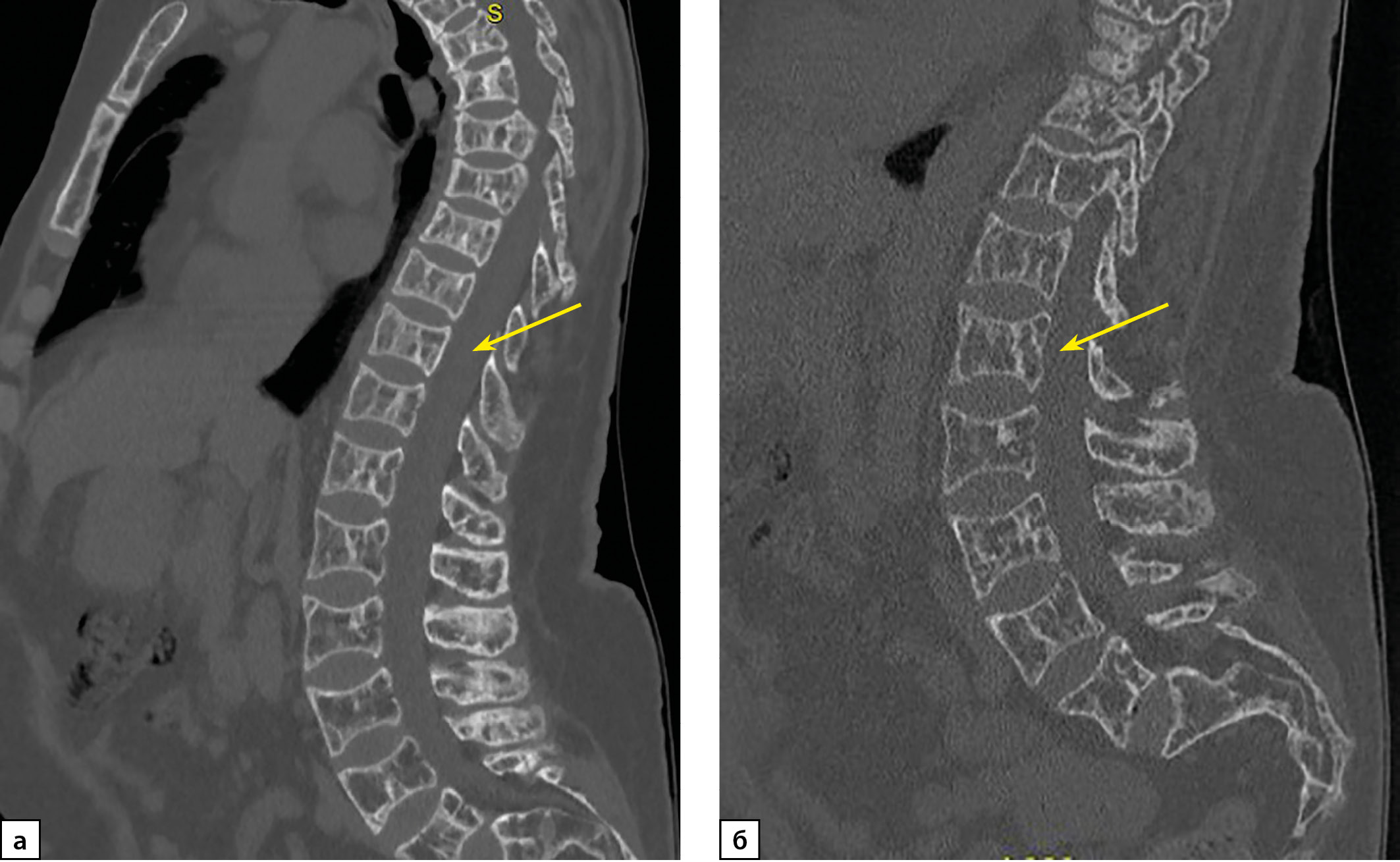 3. Рисунок 3. Пациентка П. КТ исследование позвоночника от 2023 г. а) мультипланарная реконструкция, костный режим. Определяется выраженное (более 40%, 3 ст.) снижение высоты тел позвонков с формированием двояковогнутой их деформации («рыбьи позвонки»). Структура позвонков порозна, с участками кистовидной перестройки. Костные трабекулы утолщены. б) КТ-исследование поясничного отдела позвоночника, сагиттальная проекция. Определяется выраженное (более 40%, 3 ст.) снижение высоты тел позвонков с формированием двояковогнутой их деформации («рыбьи позвонки»). Структура позвонков порозна, с участками кистовидной перестройки. Костные трабекулы утолщены. КТ картина без динамики по сравнению с 2022 г. | |