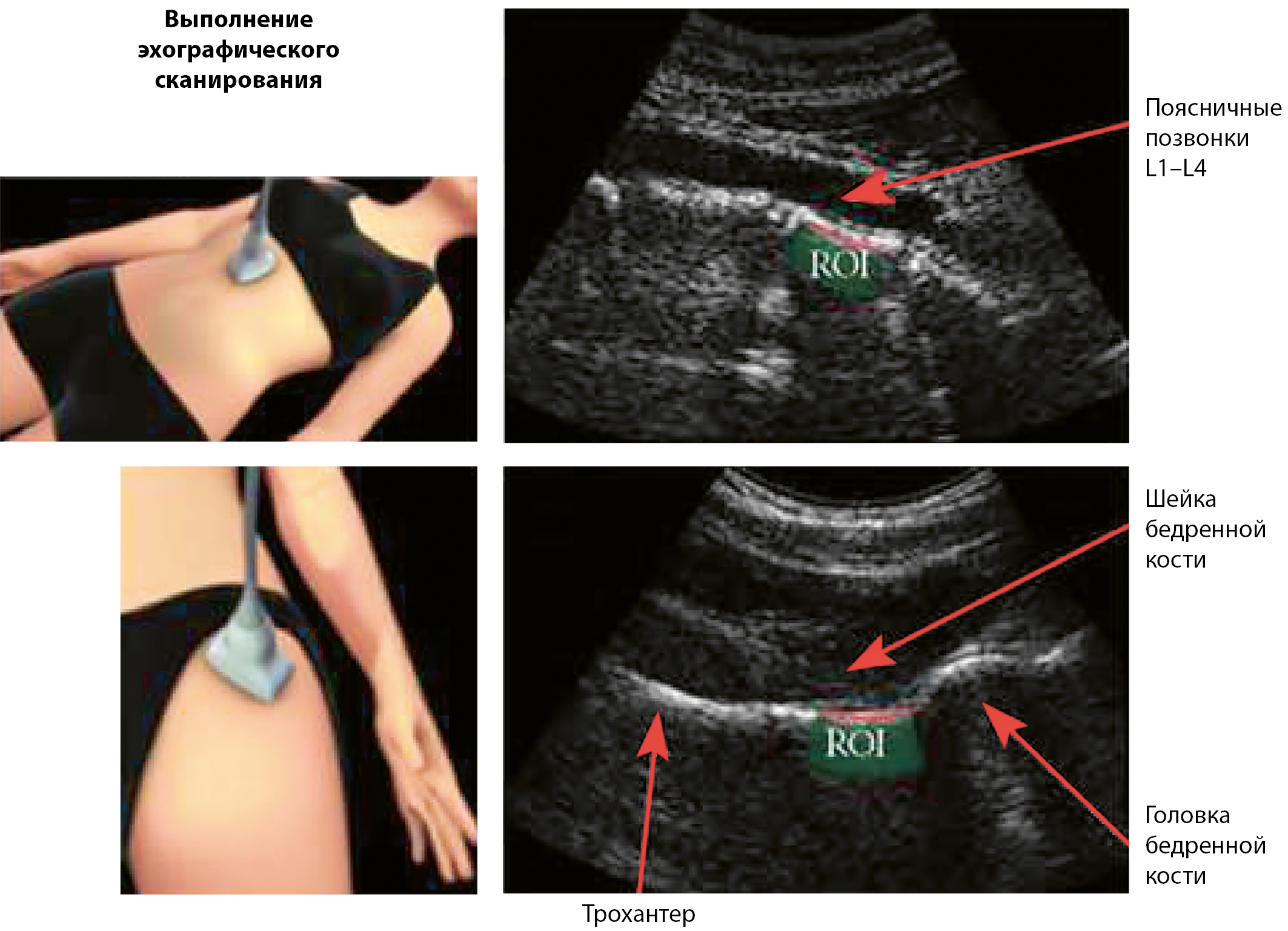 При проведении исследования сканированию подвергаются аксиальные участки скелета, как и при рентегновской денситометрии — проксимальный отдел бедренной кости и поясничные позвонки. Визуализация осуществляется путем сканирования искомых областей датчиком 3,5 МГц через переднюю брюшную стенку и/или область верхней трети бедра с подбором параметров фокуса и глубины в зависимости от конституции пациента (рис. 1) [17].