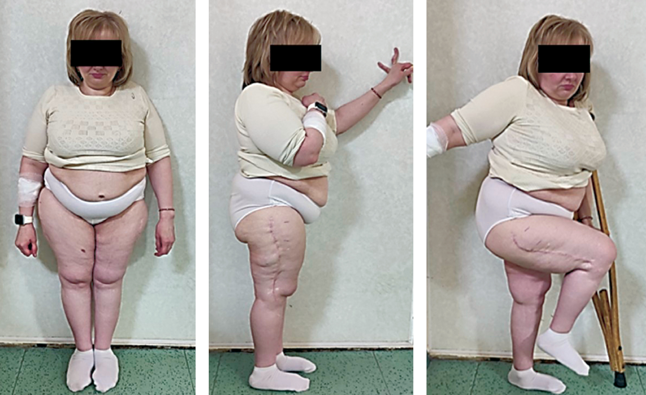 Последнее обращение к травматологу-ортопеду в ноябре 2023 г. было связано с тотальной нестабильностью левого коленного сустава смешанного генеза (гипермобильность и травма) на фоне гонартроза. Из-за нестабильности левого коленного сустава пациентка передвигается при помощи костылей, ограничивая нагрузку преимущественно на левую нижнюю конечность, и использует полужесткий ортез для коленного сустава. Подвижность в правых коленном и тазобедренном суставах ограничена углом 90 градусов (рис. 6).