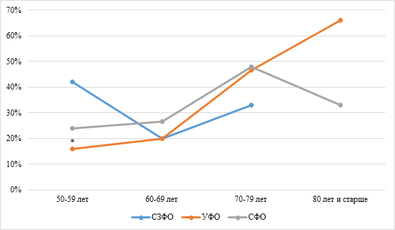 2. Рис. 2. Встречаемость трёх и более факторов риска остеопоротических переломов в зависимости от возраста: *р=0,007 для СЗФО и УФО. | |