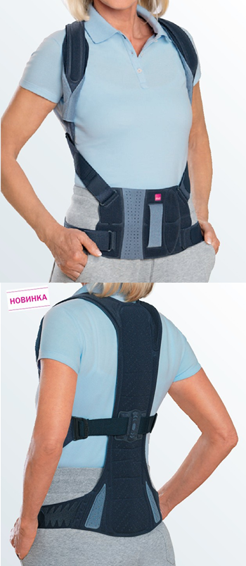 При переломах в поясничном отделе позвоночника рекомендуется пояснично - крестцовый корсет средней степени жесткости, при переломах грудного отдела позвоночника кроме того, можно рекомендовать грудопоясничный корсет Spinomed, который обеспечивает выпрямление позвоночного столба и уменьшение выраженности кифоза за счет активации разгибателей спины, также этот корсет способствует стимуляции работы околопозвоночных мышц через включение биологической обратной связи. (Рис 1). У пациентов с переломами тел позвонков на фоне остеопороза ношение корсета в течение всего дня не приводит к атрофии мышц при условии ежедневной ходьбы не менее 1,5-2 часов в день и ежедневной ЛФК в положении «лежа» и «сидя».