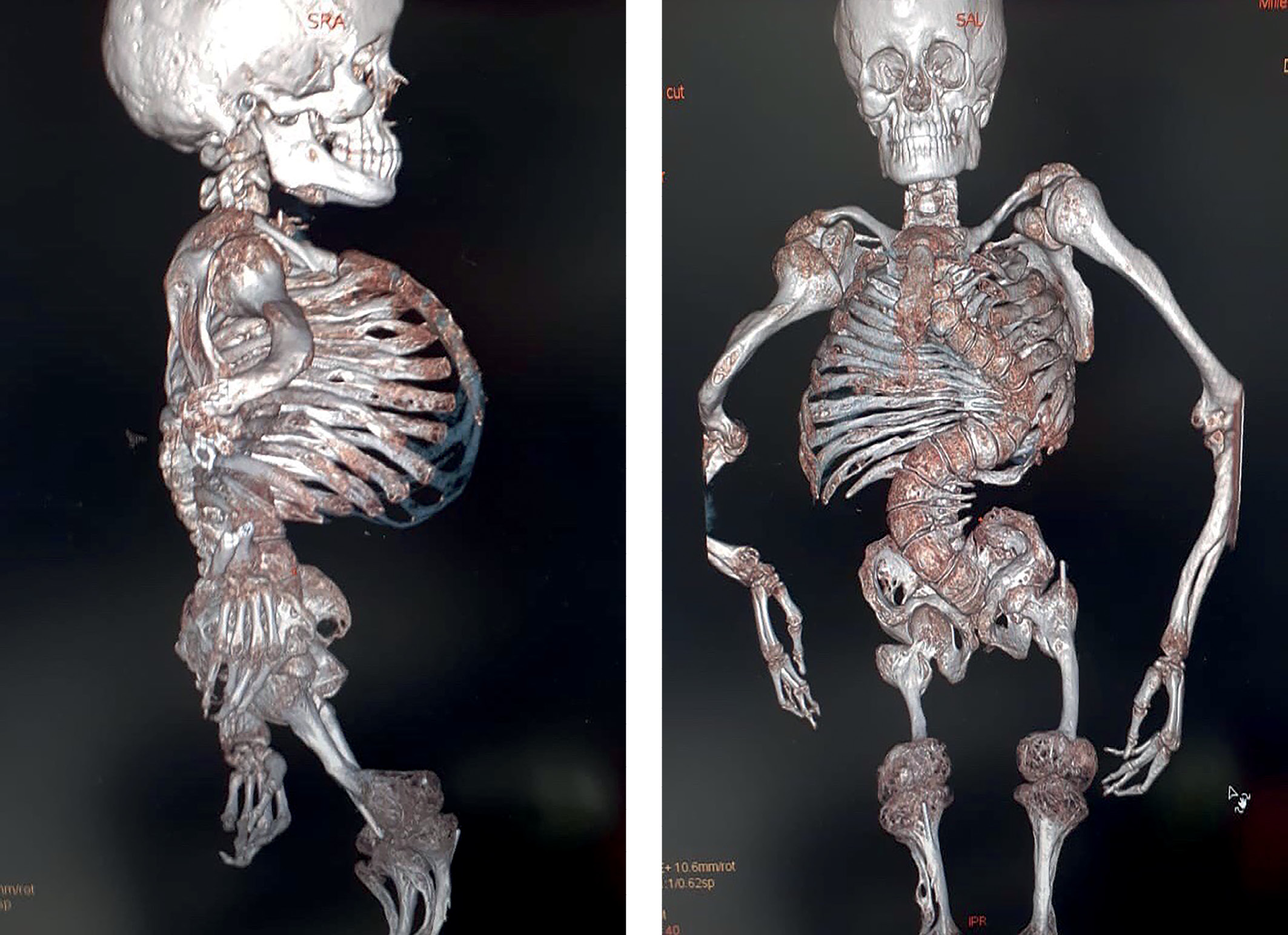 В стационаре при исследовании фосфорно-кальциевого обмена (табл. 1) показатели в пределах референсных значений, отмечено повышение уровня остеокальцина до 47,42 нг/мл, что могло быть связано с наличием нового патологического перелома. Для оценки состояния позвоночника и грудной клетки проведена мультиспиральная компьютерная томография скелета (МСКТ) (рис. 1), по результатам которой выявлены множественные компрессионные переломы позвонков с формированием «рыбьих позвонков», выраженный S-образный сколиоз пояснично-грудного отдела позвоночника, атланто-аксиальный подвывих, умеренно выраженная платиспондилия, консолидированный перелом в костном отрезке XI ребра слева, частичное сращение костей предплечья. С учетом выраженной деформации скелета данные денситометрии оказались неинформативны.