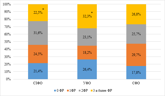 Рис. 1. Встречаемость факторов риска остеопоротических переломов у мужчин, проживающих в СЗФО, УФО и СФО: *р=0,002 для 3-х и более факторов риска у мужчин в СЗФО по сравнению с УФО.