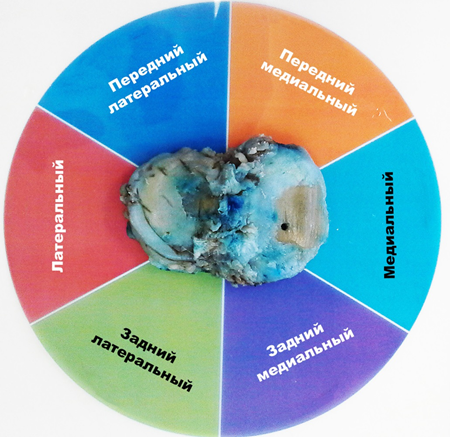 Мыщелки большеберцовой кости, резецированные во время операции и включающие хрящ и субхондральную кость, были направлены на гистологическое исследование. Размер полученных препаратов составлял от 40×55 до 55×70 мм, а наибольшая толщина – от 6 до 12 мм. С целью удобства обработки и исследования полученный спил условно разделялся на сегменты: латеральный, медиальный, переднелатеральный, переднемедиальный, заднелатеральный и заднемедиальный (рис. 1).