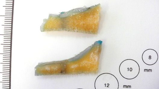В ходе приготовления гистологических препаратов принцип посегментного исследования сохранялся, что позволило детально исследовать на сагиттальных срезах структуры хряща и субхондральной зоны от периферии к центру и снаружи внутрь. Цельные костные препараты подвергались декальцинации и сегментировались. Каждый сегмент в зависимости от степени деструктивных изменений делили еще на 3–4 костные пластины и приготавливали гистологические срезы с них. Материал окрашивали гематоксилином, эозином. Часть препаратов не подвергалась декальцинации и была окрашена по Массону. Препараты исследовали под микроскопом Carl Zeiss Axio при 10, 20 и 50 кратном увеличении. Препараты описывали и производили фотофиксацию.