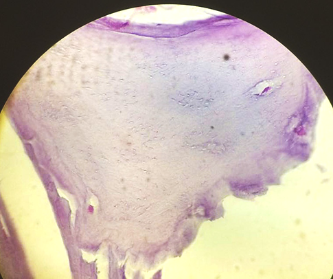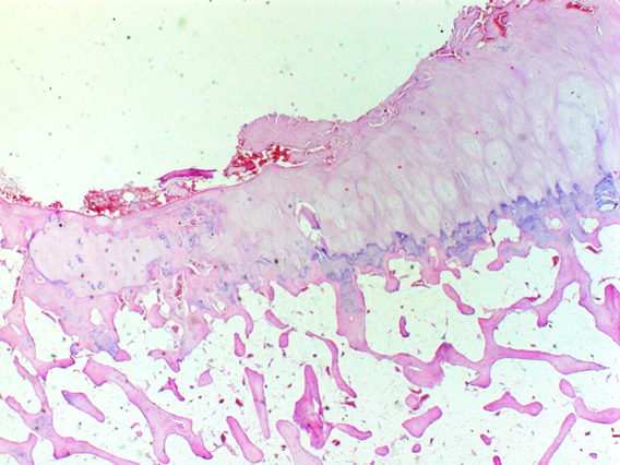 В 7 (12,5%) случаях отмечались истончение и прерывистость линии tidemark вплоть до ее полного отсутствия. При этом на поверхности субхондральной кости отмечалось разрастание грануляционной ткани. Данные изменения являются следствием значительного износа хряща и постепенного замещения его фиброзной тканью (рис. 4).
