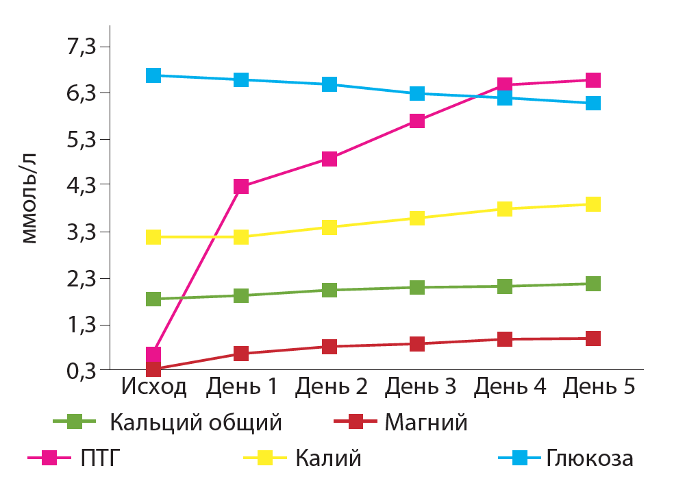 Парентеральное введение магния сульфата в дозе 4–8 мл 25% (1–2 г) раствора продолжено в виде внутримышечных инъекций каждые 6 ч. в течение трех последующих дней, с переходом на пероральный прием. Динамика лабораторных показателей представлена на рисунке 1.