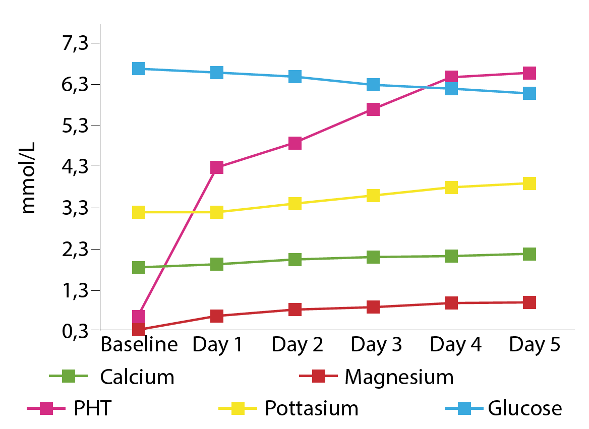 - На фоне восполнения дефицита магния уровень кальция крови нормализуется не так быстро, как ПТГ.