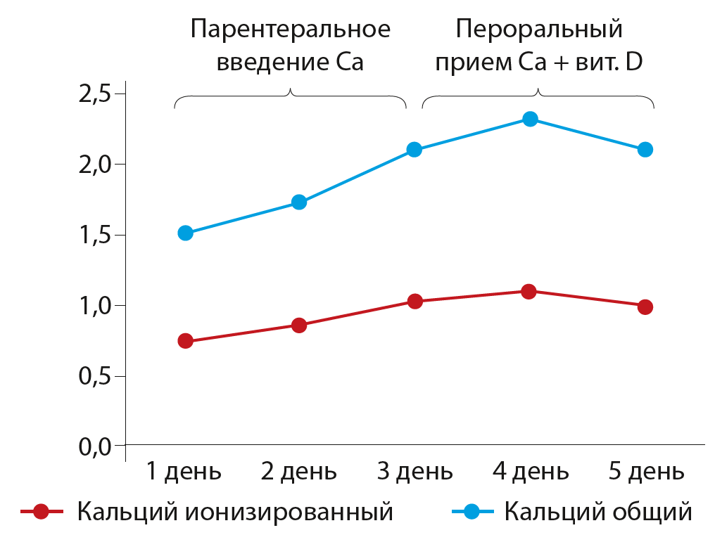 В стационаре в связи с тяжелой гипокальциемией и выраженными клиническими проявлениями проводились внутривенные инфузии 10% раствора глюконата кальция 40 мл в 200 мл 0,9% раствора хлорида натрия с выраженным положительным эффектом в виде нормализации уровня кальция (Рис. 2) и регрессом судорожного синдрома. Поскольку постоянное внутривенное введение препаратов кальция привело бы к снижению качества жизни больного, пациент был переведен на пероральный прием препаратов кальция и активных метаболитов витамина D, на фоне максимальных доз которых (7–9 г кальция и 3–4 мкг альфакальцидола в сутки) удалось добиться компенсации состояния (Рис. 2).
